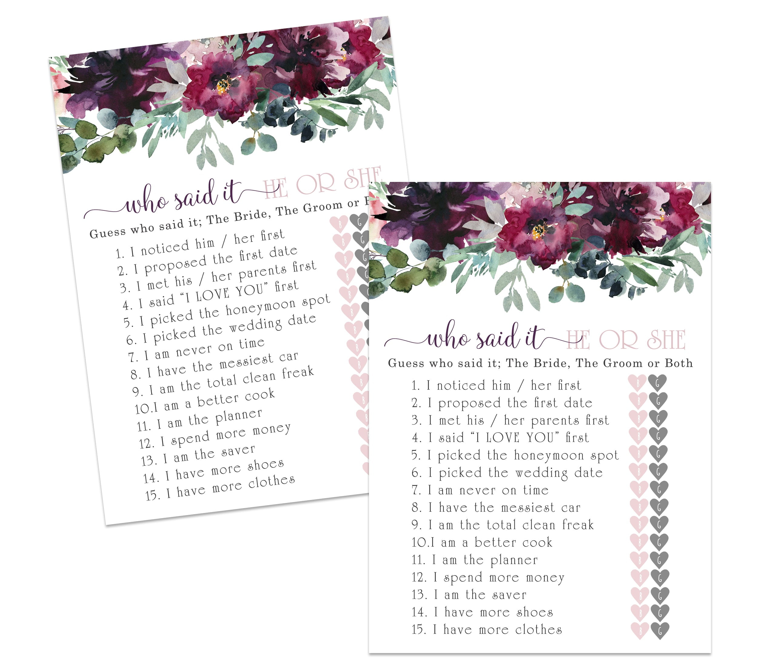 Mauve Floral Bridal Shower Game He Said Or She Said Cards 25 Pack Who Knows Bride And Groom Guessing Activity Rustic Pink Purple 5x7 Size Set Printed Paper Clever Party Walmart Com